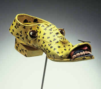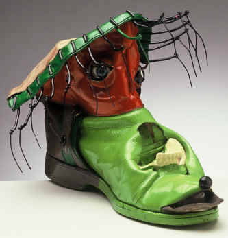 Das bewusste Wahrnehem dieses Schuhpaares auf der Bühne, ließ den profanen Gebrauchsgegenstand in seiner Phantasie eine andere Gestalt annehmen. Er entwicklte sich plötzlich zu einem Individuum das bewusst Kontakt mit seiner Umwelt suchte. Deswegen hatt er seinen Schuhskulpturen auch Augen gegeben. Sie kommunizieren mit dem Betrachter, grimmig oder humorvoll, abweised oder mit koketieredem Charme.